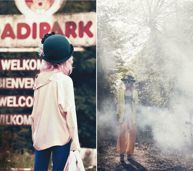 Gorgeous Charlotte Free in boho flowery outfits on a pale summer's day.